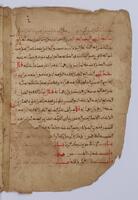 [شرح مختصر خليل ] Deuxième partie du grand commentaire de Bahrām sur le "Muẖtaṣar H̱alīl" précis de droit musulman : jurisprudence selon le rite malikite. S'étend du chapitre de l'égorgement باب الذكاة jusqu'au chapitre de la tutelle باب الحضانة . Le feuillet 33 est un feuillet de 240 x 180 mm. Il s'agit d'un feuillet du Coran qui va du verset 31 au verset 80 de la sourate XII سورة يوسف . Sur le feuillet de garde le titre est الجز الثاني من بهرام الكبير (al-Ǧuz al-ṯānī min Bahrām al-Kabīr). Incipit : بسم الله ..اللهم لا سهل الا ما جعلته سهلا باب الذكاة قطع مميز يناكح تمام الحلقوم والودجين من المقدم بلا رفع قبل التمام . Explicit : وقيل لها الأجرة في الوجهين بحسب الاجتهاد استغرقت زمانها أم لا وهو مقتضى الفقه والله أعلم بالصواب .