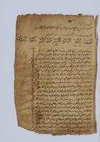 [شرح مختصر خليل ] Deuxième partie du grand commentaire de Bahrām sur le "Muẖtaṣar H̱alīl" précis de droit musulman : jurisprudence selon le rite malikite. S'étend du chapitre de l'égorgement باب الذكاة jusqu'au chapitre de la tutelle باب الحضانة . Le feuillet 33 est un feuillet de 240 x 180 mm. Il s'agit d'un feuillet du Coran qui va du verset 31 au verset 80 de la sourate XII سورة يوسف . Sur le feuillet de garde le titre est الجز الثاني من بهرام الكبير (al-Ǧuz al-ṯānī min Bahrām al-Kabīr). Incipit : بسم الله ..اللهم لا سهل الا ما جعلته سهلا باب الذكاة قطع مميز يناكح تمام الحلقوم والودجين من المقدم بلا رفع قبل التمام . Explicit : وقيل لها الأجرة في الوجهين بحسب الاجتهاد استغرقت زمانها أم لا وهو مقتضى الفقه والله أعلم بالصواب .